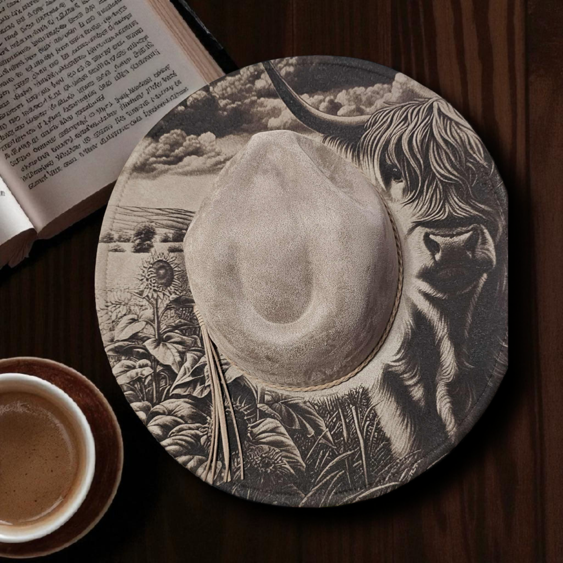 Each hat comes with a beautiful laser-engraved design and a hat band. From bees, butterflies, flowers, horses, highland cow and mermaids, just to name a few.