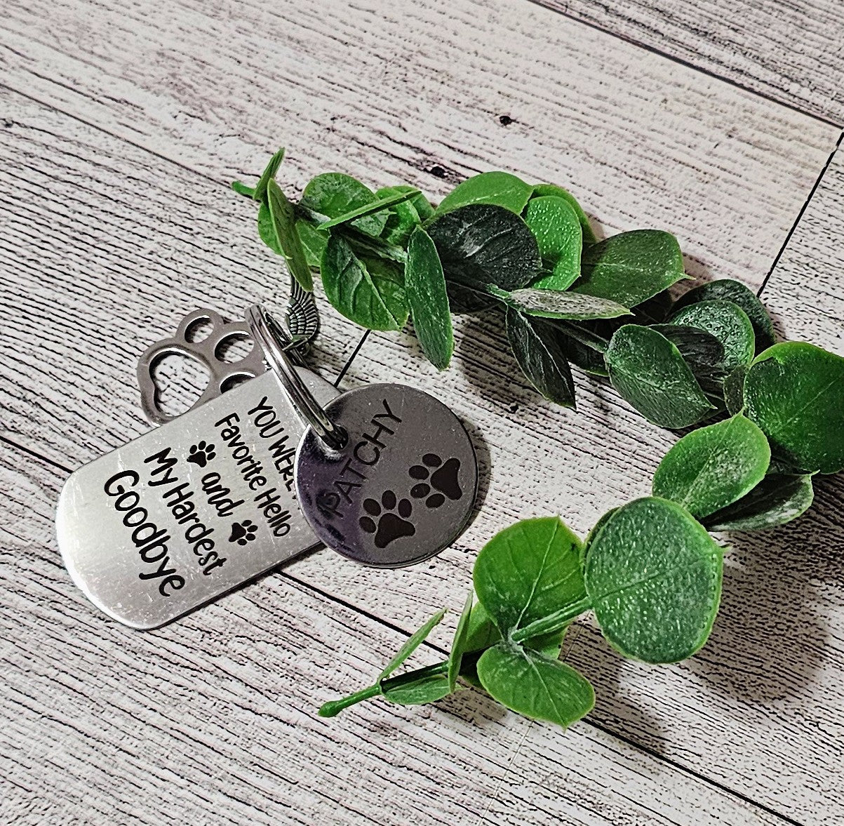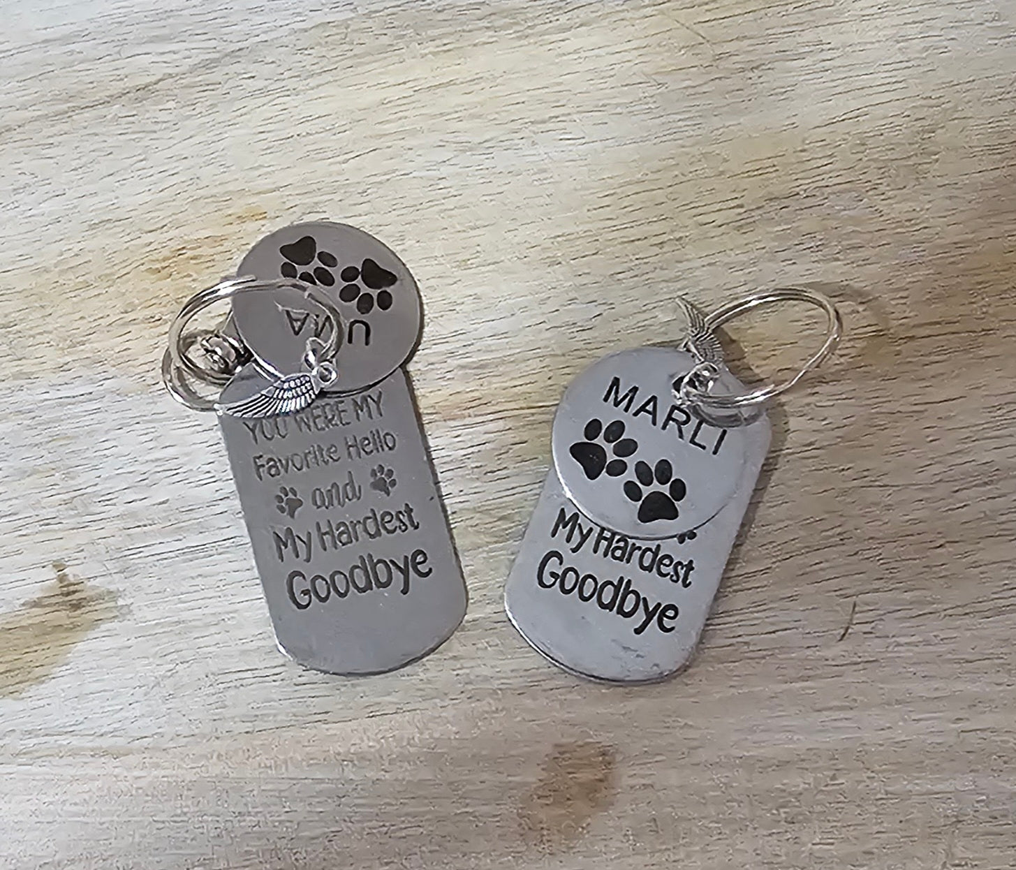 It is always sad when you have to say goodbye but this is a great way to remember them. This keychain has a wing charm and two stainless steel tags which one is personalized with your pets name. We can also adjust it for a person as well.